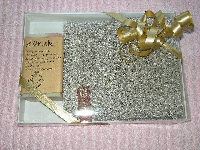 Tvättvante i skrubbig linnefrotté samt en valfri tvål i fin förpackning med snöre. Brodyr av Namn ingår.